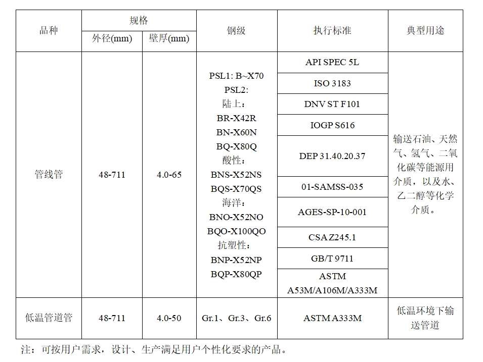 用于石油、天然气工业中的气、水、油输送。我公司已具备高强管线管、耐低温管线管、耐高温管线管、抗腐蚀管线管、海洋管线管、抗塑性变形管线管、输氢管线管、输CO2管线管等多用途、高档次产品的制造能力,可满足陆上环境、海洋环境、抗H2S腐蚀、抗CO2腐蚀、绕管铺设等多种环境的要求。钢级最高分别可以达:强度级别最高X100Q,抗H2S腐蚀最高X70QS,海洋环境最高X100QO,抗塑性变形最该X80QP。管径范围:48~711mm。
